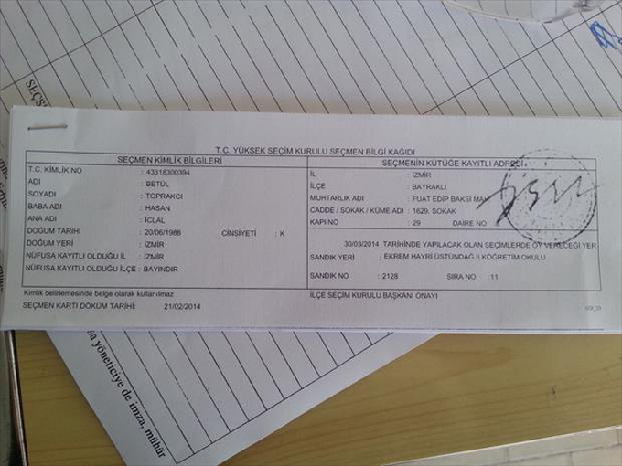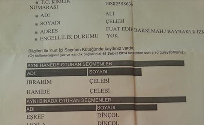 İzmir'in Bayraklı ilçesinde, yedi daireli bir apartmanın olmayan sekizinci dairesinde oturduğu varsayılan dört kişiye seçmen kâğıdı geldi. Apartman yapıldığından beri aynı yerde oturan Ali Çelebi, Yüksek Seçim Kurulu (YSK) internet sitesinden çıktısını aldığı bilgileri incelerken binada oturan seçmenler arasında tanımadığı kişiler bulunduğunu farketti. Yıllardır orada oturduğunu söyleyen ve şaşırdığını ifade eden Çelebi, ismi geçen şahısların kim olduğunu bilmediklerini, apartmanda sekiz daire de bulunmadığını söyledi.