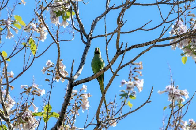 Doğal yaşam alanları Afrika ve Güney Asya olan yeşil papağanlar, parklardaki palmiye ağaçlarını yuva olarak kullanıyor. Kültürpark'ta, havaların ısınmasıyla birlikte çiçek açan ağaçlarda tüneyen papağanlar güzel görüntüler oluşturdu.