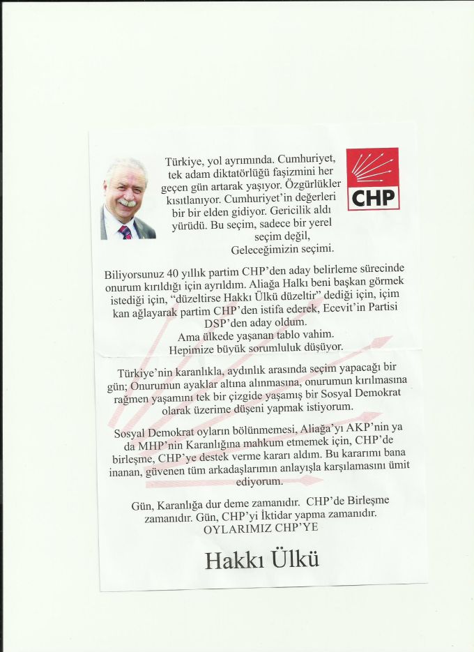 "Aliağa' da Hakkı Ülkü adına CHP amblemli bildiri dağıtarak, adaylıktan çekildiğimi yayıyorlar. 29 Mart akşamı 1000’ e yakın araçla konvoy oluşturan Hakkı Ülkü, Aliağa tarihinin en büyük gösterisini gerçekleştirmiştir. Bundan ürken sözde CHP’ li kişiler ''Eyvah Hakkı Ülkü seçimi kazandı'' diye telaşlandılar. Bunun üzerine bu bildiri ile halka cüretkârca yalan söylemekteler, sahtekârlık yapmaktalar. Görevli üyelerimize saldırmaktadırlar. Bu vesile ile, şunu da söylemek gerekir ki; Hakkı Ülkü yaşamı boyunca baskıya boyun eğmedi ve daima dik durmayı kendine ilke edinmiş bir kişiliğe sahiptir. İlkelerinin en büyüğü de; Kararlıdır, Cesaretlidir ve hiçbir haksızlığı ve baskıyı kabul etmez. Hakkı Ülkü DSP' den Aliağa Belediye Başkan Adayıdır. Seçimi kazanacaktır, Aliağa' yı layık olduğu yere taşıyacaktır. Ve bu sahtekarlığı ortaya atan kişilere de hesap soracaktır. Saygılarımla..."