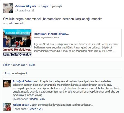 Söz konusu haberi kişisel sosyal medya hesabı üzerinden paylaşan geçtiğimiz dönemin İzmir Büyükşehir ve Konak Belediye Meclis Üyesi aynı zamanda da Konak Belediyesi Meclis 1. Başkan Vekili olan Adnan Akyarlı’dan imalı bir yorum geldi. Akyarlı habere ilişkin ‘Özellikle seçim dönemindeki harcamaların nereden karşılandığı mutlaka sorgulanmalıdır!’ yorumunda bulundu.