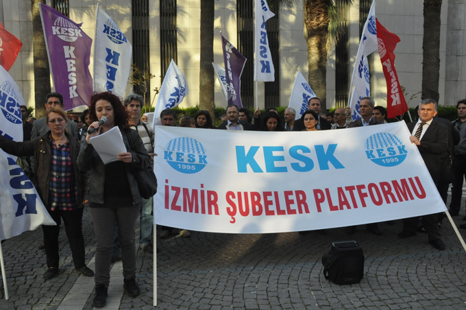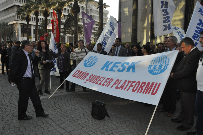 Konak'ta eylemlerini gerçekleştiren KESK üyeleri adına basın açıklamasını KESK İzmir Şube Başkanı Rukiye Çakır okudu. Yoksulluğa ve sömürüye karşı mücadele verdiklerini belirten Çakır "Bilindiği gibi kamu çalışanlarının sendika kanununda yapılan değişikliklerle 2,5 milyon kamu emekçisinin ve 1,9 milyon emeklinin iradesi yandaş konfederasyon yönetimine altın tepsiyle sunulmuştur. Aileleriyle birlikte yaklaşık 15 milyon insanı doğrudan ilgilendiren böylesine önemli bir sürecin kamu emekçilerinin ekonomik, sosyal ve demokratik haklarına yönelik beklentilerine uygun biçimde çoğulcu ve katılımcı biçimde işletilmesi bir yana adeta yandaş konfederasyon başkanıyla kapalı kapılar ardında yangından mal kaçırırcasına sürdürüldüğünün en somut kanıtı 2013 toplu sözleşme görüşmeleri olmuştur." Diye konuştu.
