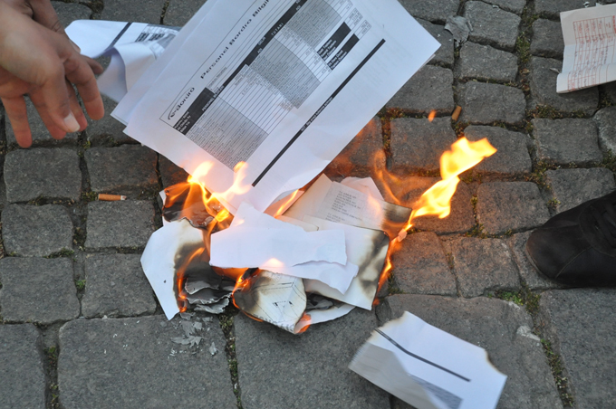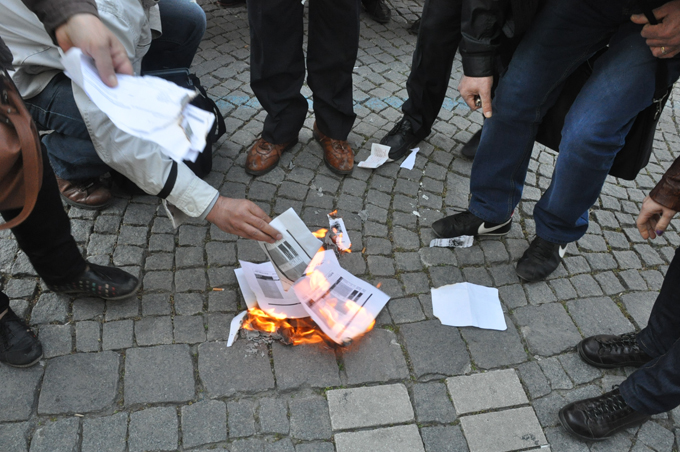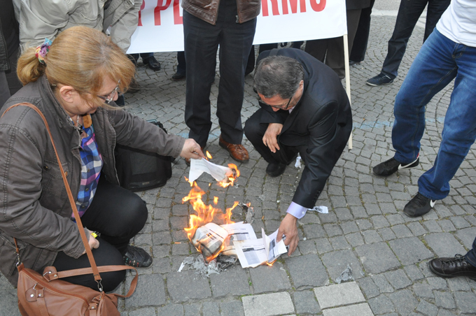 Ege'nin Sesi/Sinem Taş- Bugün akşamüzeri Konak'ta eylem yapan KESK üyeleri okudukları basın açıklamasının ardından sendika kanununda yapılan değişiklikleri ve satış sözleşmesini protesto etmek amacıyla bordrolarını yaktı.