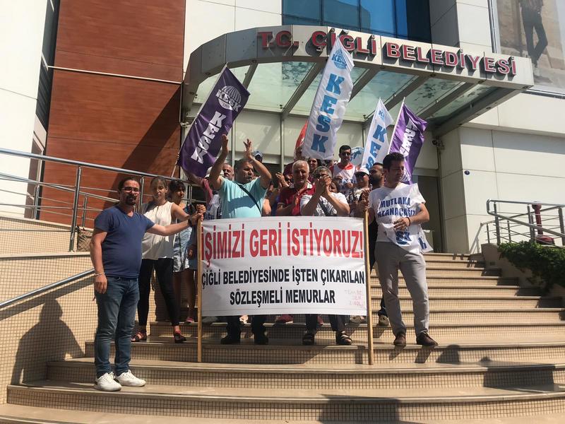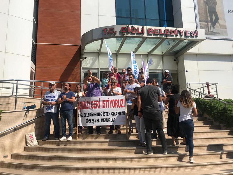 Ege'nin Sesi-Çiğli Belediyesi’nde işten çıkarılan sözleşmeli memurlar için geniş çaplı bir eylem yapıldı. İşsiz memurların eylemini KESK’e bağlı şubelerde destekledi. Çiğli Belediyesi önünde düzenlenen basın açıklamasında "İşimizi geri istiyoruz” yazılı bir pankart da taşındı. Basın açıklaması sırasında sık sık “Kurtuluş yok tek başımıza ya hep beraber ya hiç birimiz” sloganı atıldı.