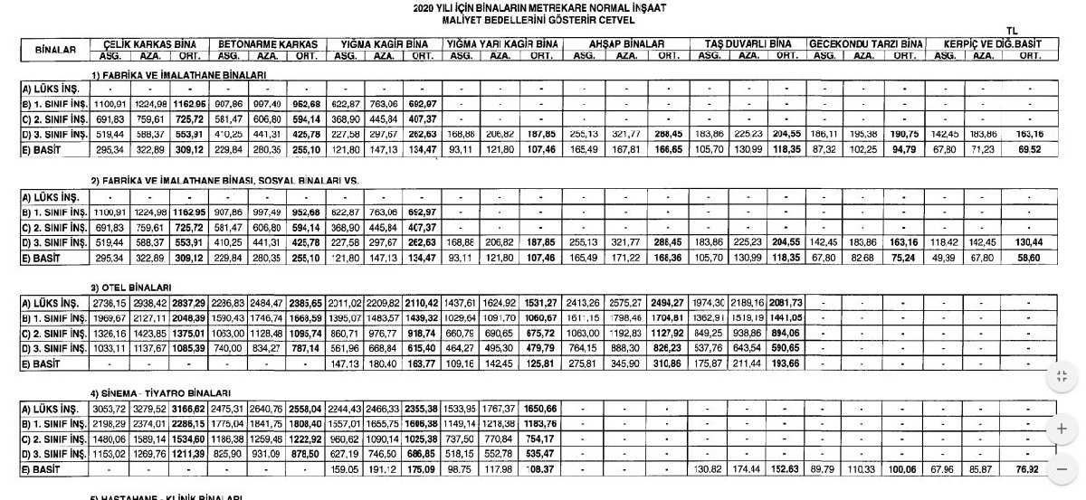 Listede ayrıca, fabrika, imalathane, otel, sinema-tiyatro, hastane, banka ve sigorta, idare, benzin istasyonu, garajlar, yurt ve okul, ile depo ve silo gibi yapıların 2020 yılı emlak vergisine esas olacak normal inşaat bedelleri de yer alıyor.