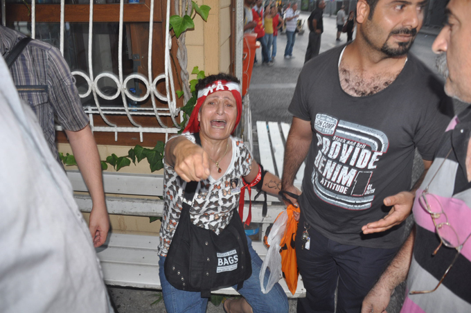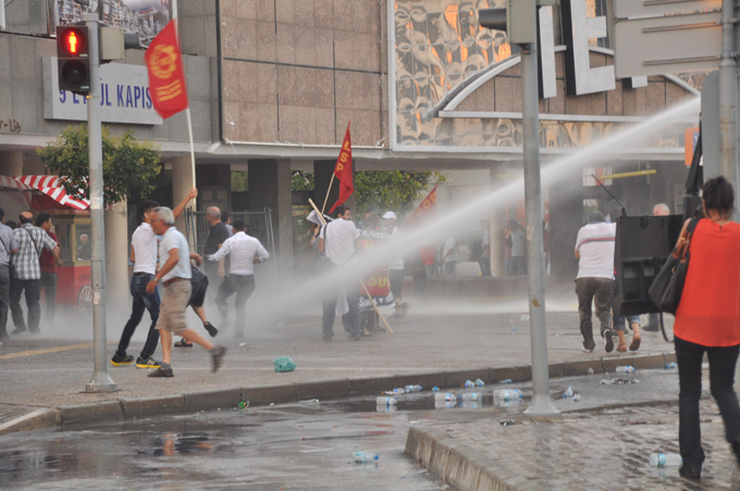 Sivas’ta öldürülenlerin fotoğraflarının asılı olduğu pankart açan eylemciler oturma eylemi yaptı. Oturma eylemi gerçekleştiren ve “Sivas’ın ateşi sönmeyecek”, “Faşizme karşı omuz omuza” sloganları atan halka polis TOMA’lardan sıkılan biber gazlı tazyikli su ile müdahale etti.