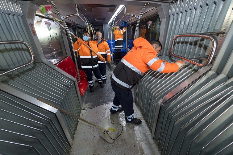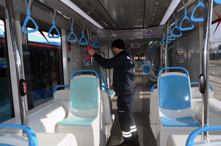 182 metro ve 38 tramvay aracı da her gün fırçalı yıkama ünitesinde otomatik olarak yıkanıyor; dezenfeksiyon sıvısı pulverize edilerek kullanıma hazır hale getiriliyor. Periyodik olarak da koltuk, tutamak gibi malzemeler tamamen sökülüp detaylı olarak temizleniyor.