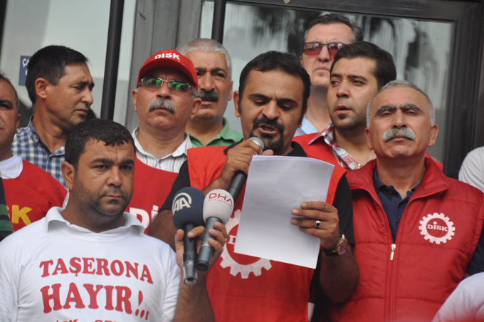 Yürüyüş sonunda binler, Konak Belediye Binası önünde toplandı ve taşerona hayır mesajı verdi. DİSK Ege Bölge Temsilcisi Memiş Sarı konuşmasında İzmir Milletvekillerini mecliste taşerona hayır demeye davet etti. Binlerce insanın önünde tek tek milletvekillerinin ismini okuyup sendikaya davet eden Sarı, bu konu için vekillerden destek beklediklerini söyledi ve "Taşerona hayır demeyi sadece siyase tenize alet etmek için kullanmamalısınız, taşeronu engellemek için kullanmalısınız" şeklinde konuştu.