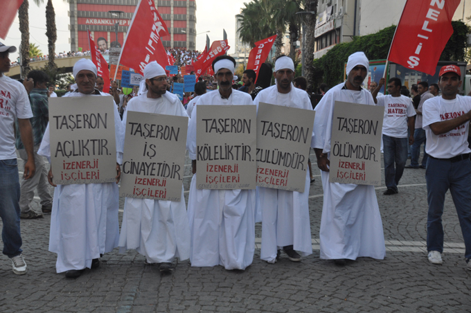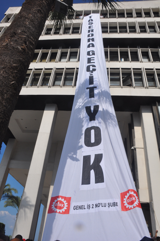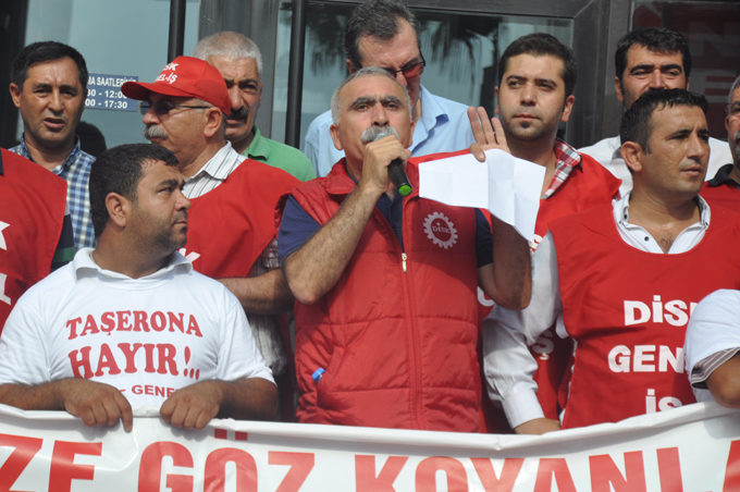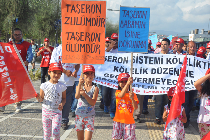 DİSK’e bağlı Genel-İş’te örgütlü binlerce işçi üç koldan Büyükşehir Belediye binası önüne yürüyerek ‘taşerona hayır’ mesajı verdi. Konak Pier önünde toplanan ana gruba Konak Vapur İskelesi ve Gazi Bulvarı yönünden gelen işçiler de eklendi.