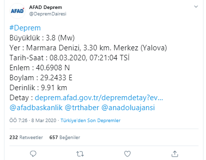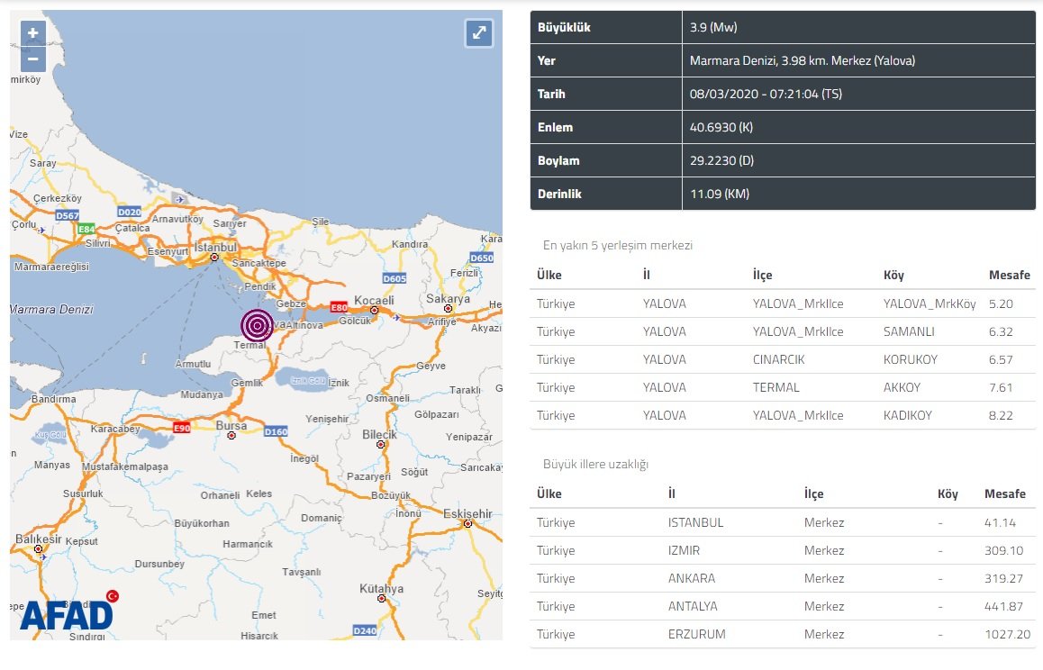 Afet ve Acil Durum Yönetimi Başkanlığı (AFAD) depremin merkez üssünü Yalova’nın 3.98 kilometre açığı, derinliğini ise 11.09 kilometre olarak duyurdu.