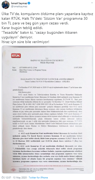 Ülke TV’de, komşularını öldürme planı yapanlara kayıtsız kalan RTÜK, Halk TV’deki ‘Sözüm Var’ programına 30 bin TL para ve beş gün yayın cezası verdi. Karar bugün tebliğ edildi. “Tesadüfe” bakın ki, “cezayı bugünden itibaren uygulayın” deniyor. İtiraz için süre bile verilmiyor!