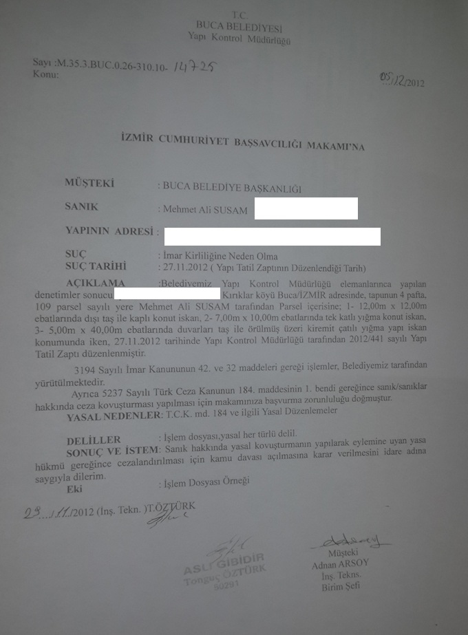 Yoksul halkın evleri, yıkım kararının hemen ardından tebligat bile yollanmadan, çevik kuvvet ve toma eşliğinde yıkılırken, Susam’ın malikânesinin yıkım kararı yaklaşık 2 yıldır Buca Belediyesi Fen İşleri Müdürlüğü’nde bekletiliyor.