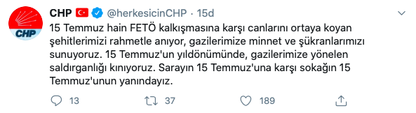 15 Temmuz hain FETÖ kalkışmasına karşı canlarını ortaya koyan şehitlerimizi rahmetle anıyor, gazilerimize minnet ve şükranlarımızı sunuyoruz. 15 Temmuz'un yıldönümünde, gazilerimize yönelen saldırganlığı kınıyoruz. Sarayın 15 Temmuz'una karşı sokağın 15 Temmuz'unun yanındayız.