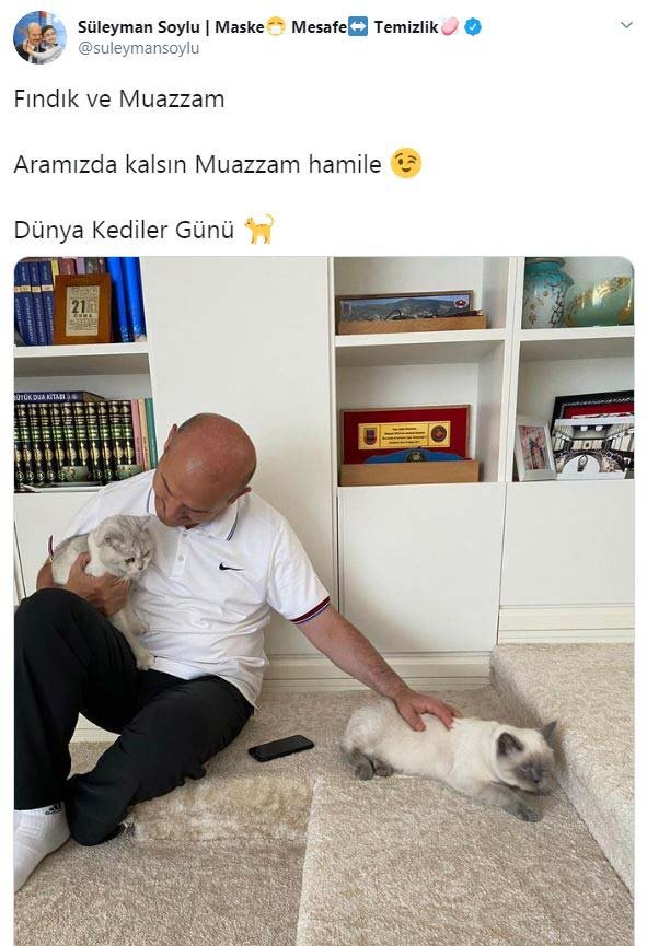 Soylu, Twitter hesabından paylaştığı mesajında “Fındık ve Muazzam. Aramızda kalsın Muazzam hamile” dedi. Bakan Soylu'nun paylaştığı fotoğraf birçok kullanıcı tarafından beğenildi. Dünyanın her yerinde olmasa da 8 Ağustos bazı ülkelerde “Dünya Kedi Günü” olarak kutlanıyor. İtalyanlar tarafından kedilerin önemine dikkat çekmek için kabul edilen Kediler Günü, bugünün yanı sıra ABD'de 29 Ekim'de kutlanırken, Rusya'da 1 Mart'ta ve Polonya'da 17 Şubat'ta kutlanıyor.