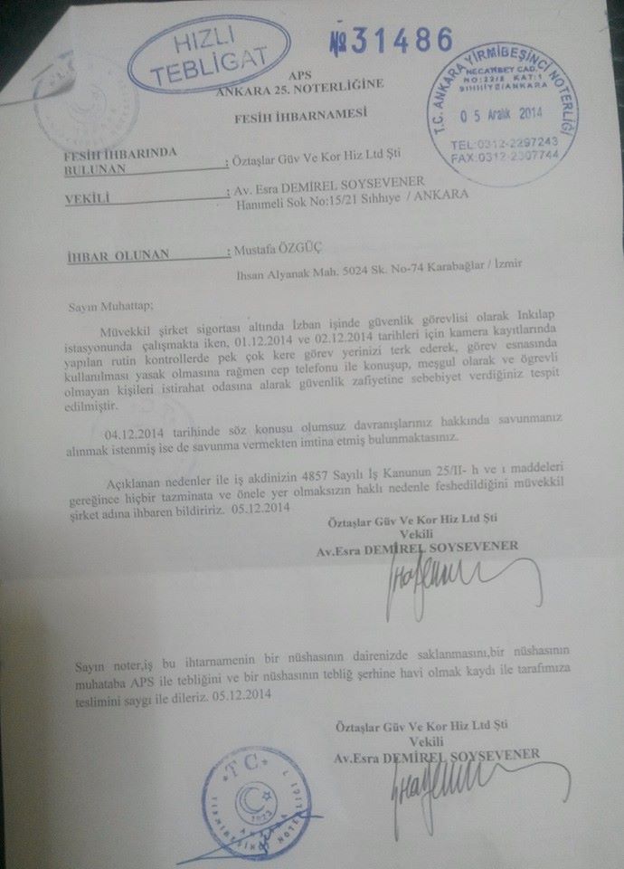 Ege'nin Sesi/Ulaş Üstündağ-İzmir İZBAN’da güvenlik görevlisi olarak çalışan Mustafa Özgüç'ün başına iş yeri sendika temsicisi olduktan sonra gelmeyen kalmadı. Yaklaşık 5 yıldan beri İZBAN’da çalışan Özgüç sendika temsilcisi olduktan sonra hakkında 3 günde tam 16 tutanak tutuldu. Yukarıdan baskı var denilerek iş akdi feshedildi