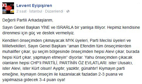 Ege'nin Sesi/Neşe Yavuz- CHP eski PM üyesi Levent Eyipişiren büyük ses getirecek bir iddiayı sosyal medyadan takipçileri ile paylaştı. Bazı vekillerin ve MYK üyelerinin, milletvekili seçiminde izlenecek yolu değiştirmek için teklifte bulunduğunu, önseçim olursa şuradan şu kadar alevi çıkar şuradan şu kadar kürt çıkar diyerek ayrıştırma yaptıklarını belirtti.