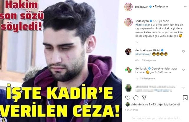 Kısa sürede sosyal medyada gündem olan Kadir Şeker hakkında bir paylaşım da ünlü şarkıcı Seda Sayan'dan geldi. Instagram hesabından Şeker'in fotoğrafını paylaşan Sayan, "12,5 yıl hapis Kadir Şeker... Bizi affet senin için hiç bir şey yapamadık. Artık sokakta şiddete maruz kalan kadınların yardımına kim koşar üzgünüz çok yazık oldu çok" dedi.