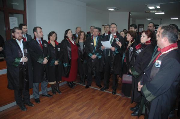 Avukatlar gün boyu duruşmalara, yakalarına saldırıya uğrayan meslektaşlaırının taktığı fotoğraflarla girdi.