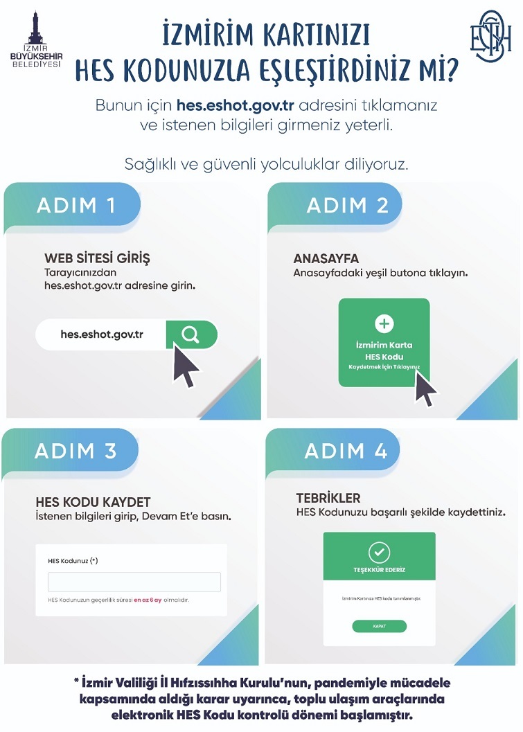 İzmir Büyükşehir Belediyesi, İzmir Valiliği İl Hıfzıssıhha Kurulu’nun pandemiyle mücadele çalışmaları kapsamında aldığı karar uyarınca toplu ulaşım araçlarında elektronik HES Kodu kontrolü uygulamasını 30 Ekim Cuma gününden itibaren başlatıyor. İlk etapta, kişiselleştirilmiş (fotoğraflı) İzmirim Kart biniş bilgileri, her gün T.C. Sağlık Bakanlığı ile paylaşılacak. Yurttaşların, kişiselleştirilmiş ve hamiline İzmirim kartlarını, 15 Kasım’a kadar “hes.eshot.gov.tr” adresi üzerinden HES Kodları ile eşleştirmesi isteniyor.