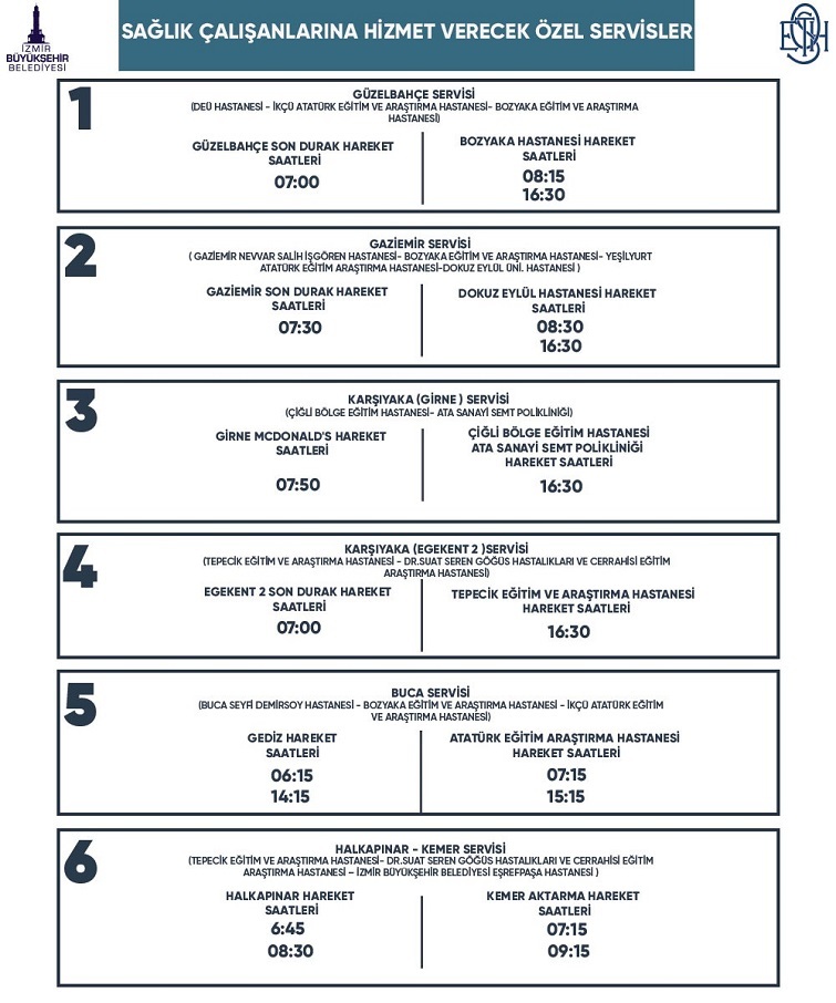 ESHOT Genel Müdürlüğü’nün, sağlık çalışanları için ücretsiz tahsis ettiği altı özel servis de hastanelerin vardiya saatlerine uygun olarak hafta boyunca her gün seferlerine devam edecek. “Sağlık Görevlileri İçindir” yazılı tabelanın bulunduğu otobüsler; Buca, Gaziemir, Güzelbahçe, Karşıyaka ve Yenişehir’den sabah ve akşam belirli saatlerde karşılıklı seferler yapıyor. Güzergâh bilgileri ve sefer saatleri şöyle: