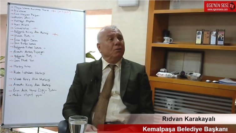 Ege'nin Sesi- Kemalpaşa Belediye Başkanı Rıdvan Karakayalı Ege'nin Sesi TV'de Ulaş Üstündağ'ın konuğu oldu. Başkan Rıdvan Karakayalı çalışmalarının odağına insanı koyduğunu belirterek: "Çalışmalarımızın temelinde insan olduğu için gösterişe yönelik adımlar atmıyoruz. Biz dar gelirlilere, öğrencilere ve kadınlara ulaşmaya çalışıyoruz" dedi.