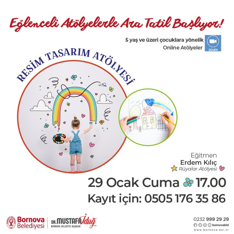 Bornova Belediyesi Kültür İşleri Müdürlüğü, yarıyıl tatilinde öğrencilere yönelik biri dizi dijital atölye düzenleyecek. Resimden edebiyata, kent kültüründen kodlamaya kadar birçok alanda düzenlenecek olan online atölyelerle Bornovalı minikler tatilde de kendilerini geliştirme fırsatı yakalayacak. 29 Ocak’ta saat 17.00’de başlayacak olan resim atölyesi ile start verecek olan etkinlikler, 11 Şubat saat 17.30’da düzenlenecek olan Müziğin Şifası ile son bulacak.