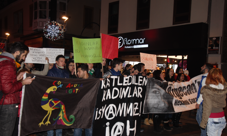Ege'nin Sesi-Oğuz Can Demirören/Mersin'de öldürülen Özgecan Aslan için İzmir Büyükşehir Belediyesi önünde toplanan bir grup, sloganlar eşliğinde Alsancak'a kadar yürüdü. Alsancak'ta Sevinç Pastahanesi önünde bir süre oturma eylemi yapan grup ÖSYM önüne kadar tekrar yürüyerek eylemi burada sonlandırdı.