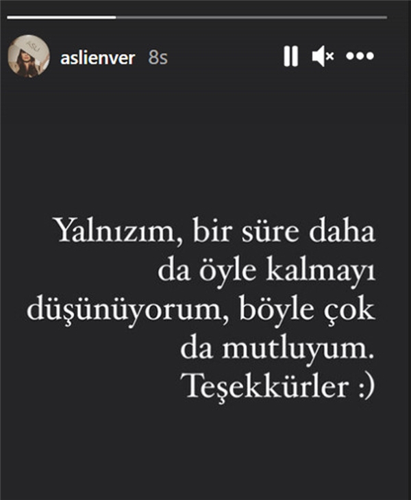 Yaşananlardan sonra Aslı Enver'den açıklama geldi. Ünlü oyuncu, "Yalnızım, bir süre daha da öyle kalmayı düşünüyorum. Böyle çok mutluyum." dedi.