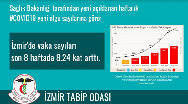 Ege'nin Sesi- İzmir Tabip Odası paylaştığı tablo ile kentte yükselen vakalar sayılarını gözler önüne serdi. İzmir Tabip Odası’nın paylaştığı verilere göre son 8 haftada koronavirüs vaka sayılarında İzmir’de 8,24 kat artış görüldü.