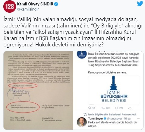 Sındır, paylaşımında şu ifadelere yer verdi; “İzmir Valiliği’nin yalanlamadığı, sosyal medyada dolaşan, sadece Vali’nin imzası (tahminen) ile “Oy Birliğiyle” alındığı belirtilen ve “alkol satışını yasaklayan” İl Hıfzısıhha Kurul Kararı’na İzmir BŞB Başkanımızın imzasının olmadığını öğreniyoruz! Hukuk devleti mi demiştiniz?”