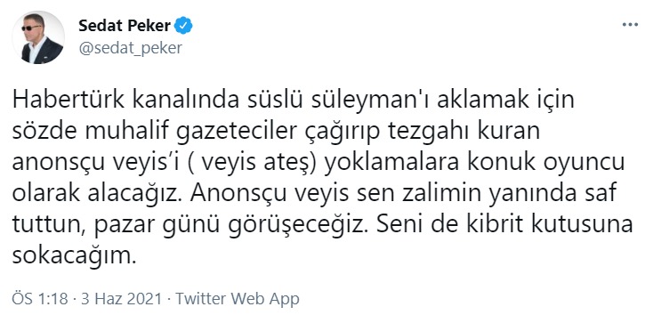 Twitter hesabından paylaşım yapan Peker, Veyis Ateş için "Anonsçu veyis sen zalimin yanında saf tuttun, pazar günü görüşeceğiz. Seni de kibrit kutusuna sokacağım" ifadelerini kullandı.