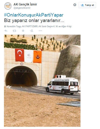 Ege'nin Sesi-Ulaş Üstündağ/AKP İzmir İl Gençlik Kolları ilginç bir paylaşıma imza attı. Başbakan Ahmet Davutoğlu'nun katılımıyla açılan Konak Tünelleri'nden CHP Buca Örgütü'ne ait olan minibüsün geçiş anını 'Biz yaparız onlar yararlanır.' notuyla twitterda paylaşan AKP İzmir İl Gençlik kolları tepki çekti.