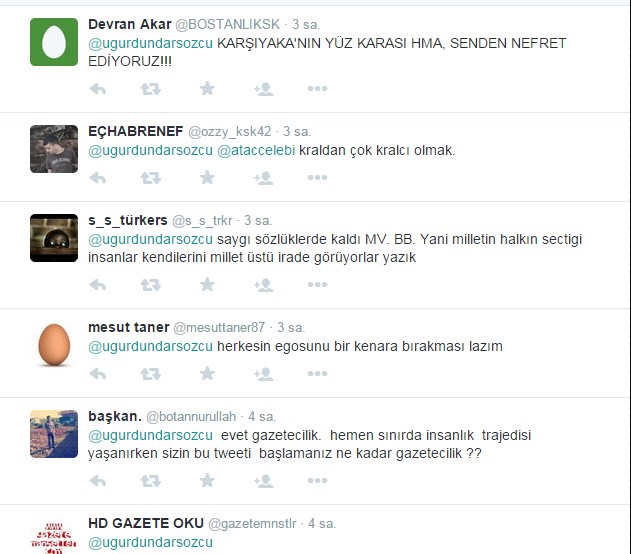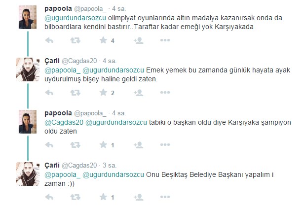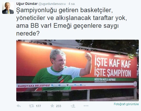 Uğur Dündar twitter adresinden Karşıyaka Belediye Başkanı Hüseyin Mutlu Akpınar'a tepki göstererek: Şampiyonluğu getiren basketçiler, yöneticiler ve alkışlanacak taraftar yok, ama BB var! Emeği geçenlere saygı nerede? İfadelerini kullandı.