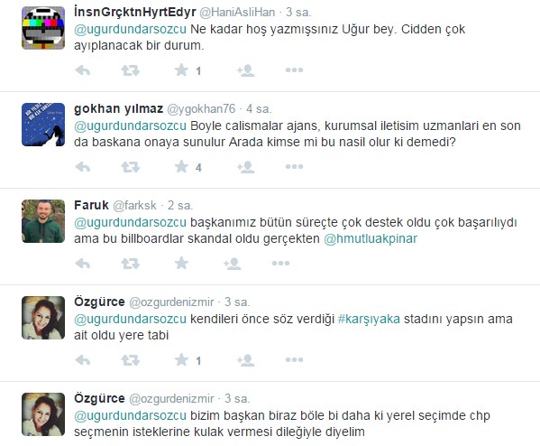 Ege'nin Sesi-Ulaş Üstündağ/Karşıyaka Belediye Başkanı Hüseyin Mutlu Akpınar'ın bilbord hazırlayarak kendi resmiyle Karşıyaka Basketbol takımının başarısını kutlamasına sosyal medya üzerinden taraftarlardan eleştiri gelmişti. Ege'nin Sesi'nin gündeme getirdiği habere bu kez de duayen gazeteci Uğur Dündar tepki gösterdi.