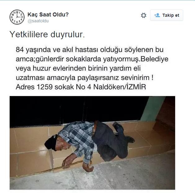 Ege'nin Sesi-Ulaş Üstündağ/İzmir Bornova İlçesi'nde Naldöken semtinde 84 yaşındaki bir insanın günlerdir sokakta yattığı belirtildi. Alzheimer hastası olduğu belirlenen yaşlının fotoğrafı ise sosyal medyada sıkça paylaşılmıştı.