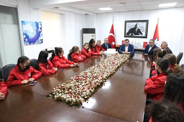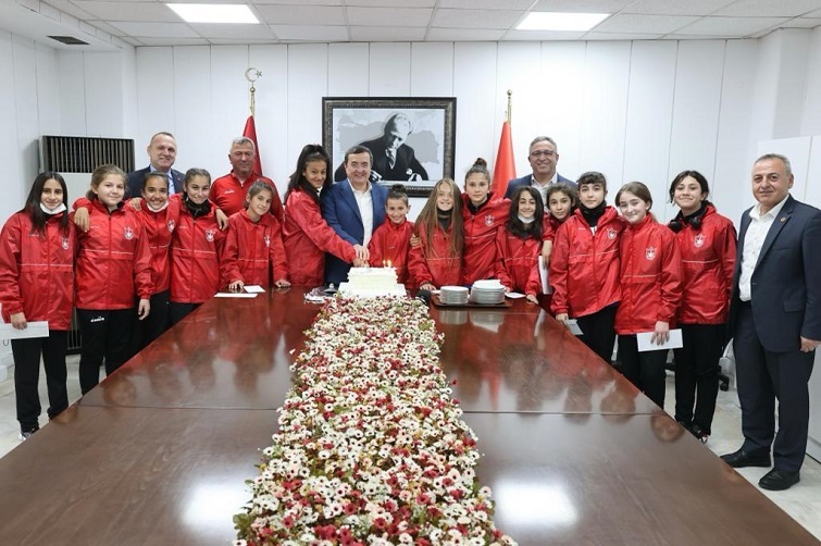 Konak Belediyespor’un altyapı takımlarından U-13 Kız Futbol Takımı, İzmir Şampiyonu oldu. Türkiye Büyük Millet Meclisi (TBMM), Gençlik ve Spor Bakanlığı ile Milli Eğitim Bakanlığı (MEB) ortaklığıyla düzenlenen “Mahallede Maç Var” 23 Nisan Futbol Turnuvası kapsamında mücadele eden takım, tüm rakiplerini mağlup ederek Türkiye Şampiyonası’nda İzmir’i temsil etmeye hak kazandı. Konak Belediye Başkanı Abdül Batur da Teknik Direktör Varol Karul, Spor Müdürü İsmail Karşı, Belediye Meclis üyesi Cumhur Ter ve Belediye Başkan Yardımcısı Asker Güneş ile birlikte takım oyuncularını makamında konuk ederek final sevinçlerine ortak oldu. Heyecan ve mutlulukları gözlerinden okunan genç sporcular Başkan Batur’la birlikte galibiyet pastası kesti. Başkan Batur, “Kız Futbol takımımız İzmir’i Süper Lig’de temsil ediyor. U-13 takımımız da ablalarının izinden giderek göğsümüzü kabartan başarılarla bize büyük gurur yaşatıyorlar. Hepsini ayrı ayrı kutluyorum. Hepsi pırıl pırıl, hepsi çok yetenekli. Türkiye finalinde de galip gelerek şampiyon olacaklarına yürekten inanıyorum. Şampiyon takımımıza güvenimiz tam” diye konuştu.