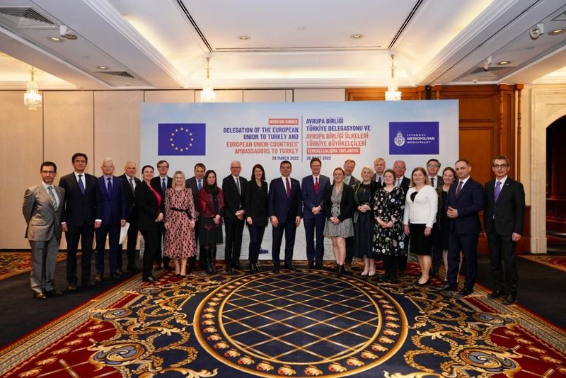 İBB Başkanı Ekrem İmamoğlu, AB Türkiye Delegasyonu Başkanı Büyükelçi Nikolaus Meyer-Landrut ve farklı ülkelerin büyükelçilerinden oluşan heyetle bir araya geldi. Toplantıda; Rusya-Ukrayna savaşından AB ülkelerinin bu konudaki tutumuna, Türkiye’nin AB’ye giriş sürecinden İBB’nin AB’ye bağlı finans kuruluşlarından beklediği finansmanla ilgili sürecin yavaş ilerlemesine kadar birçok konu konuşuldu. AB Delegasyonu ile iklim değişikliği, afetlere hazırlık, ulaştırma ve kentsel mobilite, okul öncesi eğitimin yaygınlaştırılması ve sığınmacılar konularında aldıkları kararlarda ciddi ilerleme kaydedilemediği eleştirisini dile getiren İmamoğlu, “AB Delegasyonu’nun ve AB ülkelerinin, Türkiye’de ayak sesleri duyulan değişim sürecine şimdiden hazırlanmasını ve iş birliğimizin çapının büyütülmesini umuyoruz” dedi.