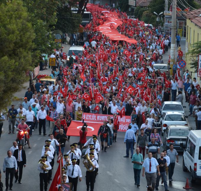 Menemen Belediye Başkanı Tahir Şahin’in çağrısıyla birlikte, ilçedeki tüm Meslek Odaları, Sivil Toplum Kuruluşları, Siyasi Partiler ve Muhtarların bir araya gelerek düzenlediği “9 Eylül Kurtuluş Günü ve Teröre Lanet Yürüyüşü”ne 10 bin’e yakın Menemenli katıldı.