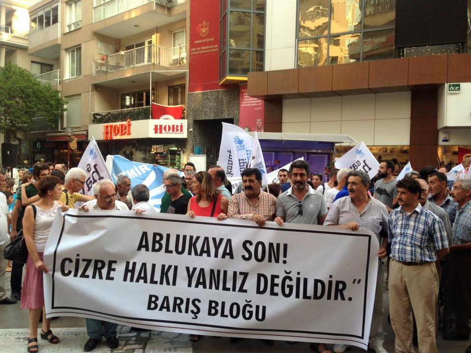 İZMİR Barış Bloğu, Cizre ve diğer ilçelerdeki sokağa çıkma yasaklarını basın açıklamasıyla protesto etti. Basın açıklamasını yapan Zeki Gül, daha fazla gözyaşı dökmek ve daha fazla tabut taşımak istemediklerini söyledi.