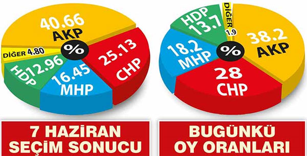 AKP 38.2, CHP 28, MHP 18.2, HDP 13.7… 7 Haziran’da yüzde 40.66’yla sandıktan birinci çıkan ancak HDP’nin barajı geçmesiyle tek başına iktidar olamayan AKP’nin yüzde 2.5’luk bir kayıp yaşadığı gözlendi. AKP’deki düşüşe rağmen muhalefet partileri ise yükselişte… CHP, oyunu yüzde 25’ten yüzde 28’e artırırken; MHP’nin yüzde 2’ye yakın artış yakaladığı, HDP’nin de oyunu yaklaşık yüzde 1 oranında yükselttiği görüldü. Hakan Bayrakçı, sonuçları şöyle değerlendirdi: “AKP oy kaybetmeye devam ediyor, tek başına iktidara gelemiyor. Koalisyon dönemi kaçınılmaz. AKP, yüzde 38’lerde devam ederse 232-240 arası milletvekili çıkarabilir. CHP ve MHP şu anki oy oranlarını korursa 276 sandalyeyi yakalayabilir. Böylece iki partili koalisyon mümkün olabilir.”