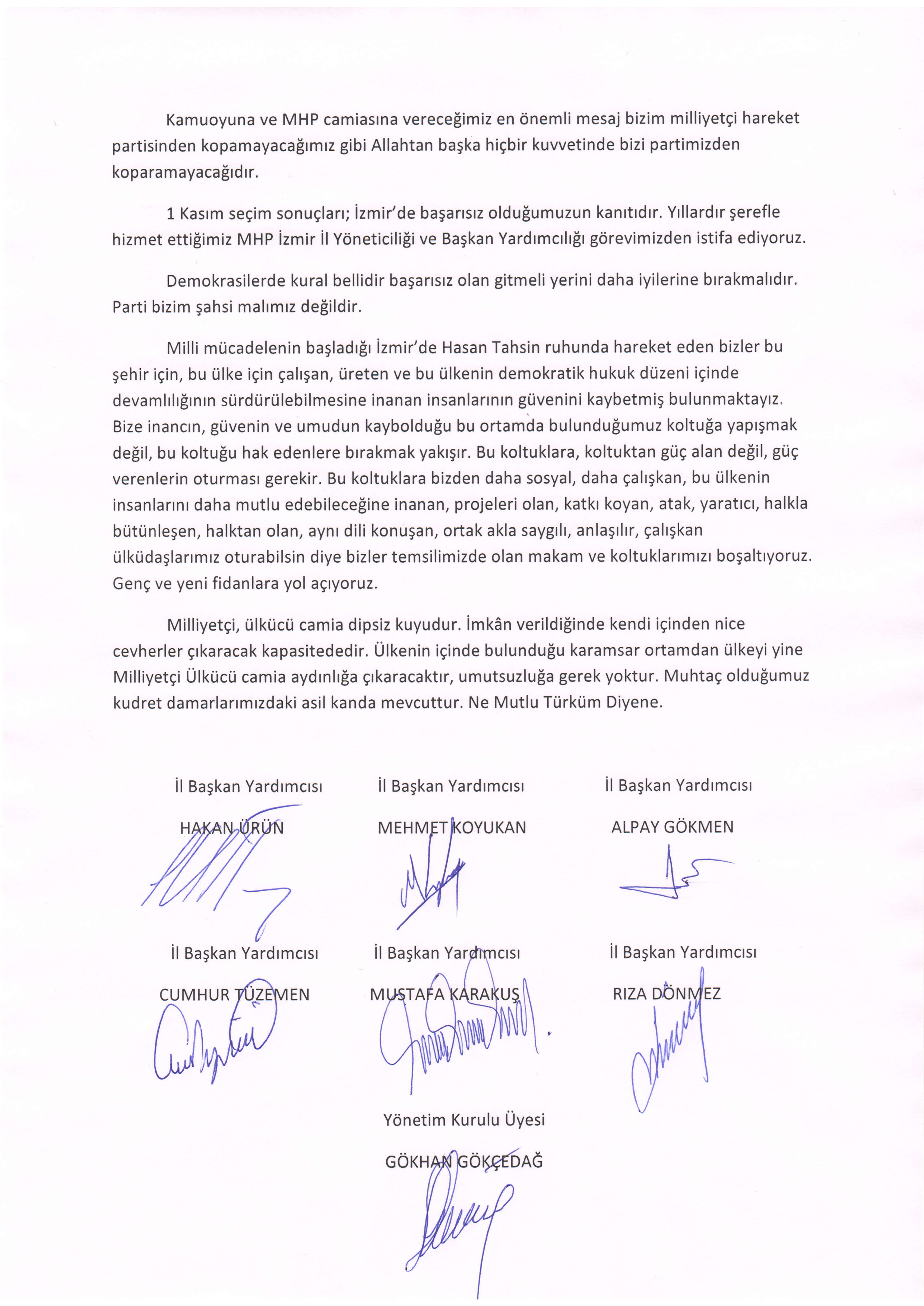 MHP İzmir İl Yöneticileri yazılı bir açıklama yaparak istifalarını sundu. Açıklamada, “Kamuoyuna ve MHP camiasına verdiğimiz en önemli mesaj bizim Milliyetçi Hareket Partisi’nden kopmayacağımız gibi Allah’tan başka hiçbir kuvvetinde bizi partimizden koparamayacağıdır.