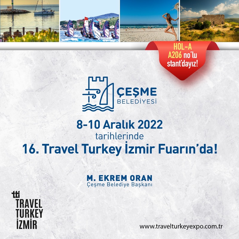 Kültür ve Turizm Bakanlığı himayelerinde, İZFAŞ ve TÜRSAB Fuarcılık iş birliği ile dünyanın dört bir yanından turizm profesyonellerini bir araya getiren ve Türkiye'nin en büyük uluslararası turizm platformlarından biri haline gelen Travel Turkey İzmir, 16'ncı kez kapılarını açıyor. Bu yıl 8-10 Aralık 2022 tarihlerinde Fuarizmir'de gerçekleşecek fuarda Çeşme’de geniş bir katılımla yer alacak. Yeryüzündeki cennet Çeşme’nin eşsiz koyları, berrak suları, muhteşem doğasının ziyaretçilere anlatılacağı fuarda tüm turizm bileşenleri aynı çatı altında yer alacak. Çeşme Turistik Otelciler Birliği (ÇEŞTOB), Çeşme Belediyesi Şirketi ÇEŞTUR A.Ş. tarafından özel olarak tasarlanan stantta Çeşme Belediyesi çatısı altında yer alacak.