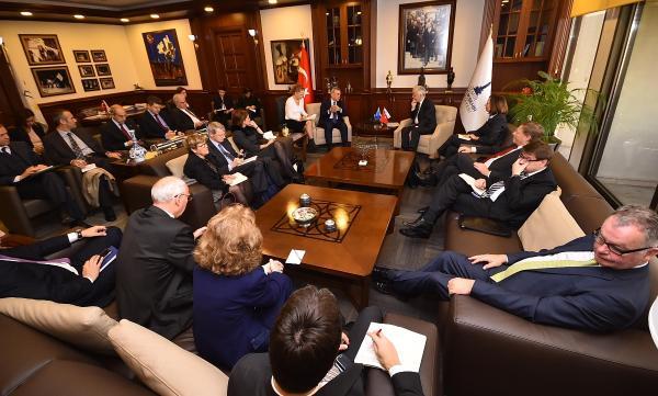 Avrupa Birliği Türkiye Delegasyonu Başkanı Hansjoerg Haber ve Avrupa Birliği üyesi 18 ülkenin büyükelçisi, maslahatgüzarı ve misyon başkan yardımcısı İzmir Büyükşehir Belediye Başkanı Aziz Kocaoğlu'nu makamında ziyaret etti. Suriyeli göçmenler ve bu göçün kentteki sosyal, kültürel ve ekonomik etkilerinin masaya yatırıldığı ziyarette konuşan Delegasyon Başkanı Hansjoerg Haber, İzmir'e gelmekten dolayı mutlu olduğunu, iyimser beklentilerinin her zaman burada kabul gördüğünü söyledi. Pazar günü Brüksel'de yapılacak Türkiye-Avrupa Birliği (AB) zirvesinde, Türkiye-AB ilişkilerinin yanı sıra İzmir için son derece sıcak bir nokta olan düzensiz göçün kontrolü konusunun da ele alınacağını hatırlatan Haber, “Birkaç haftadır bu konularda değişik çevrelerden de bilgi edindik. Bu zorlukla Türkiye'nin nasıl baş ettiğine dair bilgilerimiz var. Ankara'daki muhataplarımızla sürekli temas halindeyiz" dedi. Göç konusunda kent açısından Başkan Kocaoğlu'nun kaygılarını da soran Haber, “Özellikle sizin fikirlerinizi almak bizim için çok önemli" dedi.