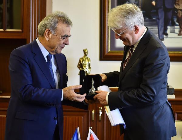 Toplantıda konuk heyet, Başkan Aziz Kocaoğlu'na Avrupa Dönem Başkanlığı tarafından hazırlanan bir kravat hediye ederken, Başkan Kocaoğlu'da Saat Kulesi'nin gümüş rölyefini verdi.