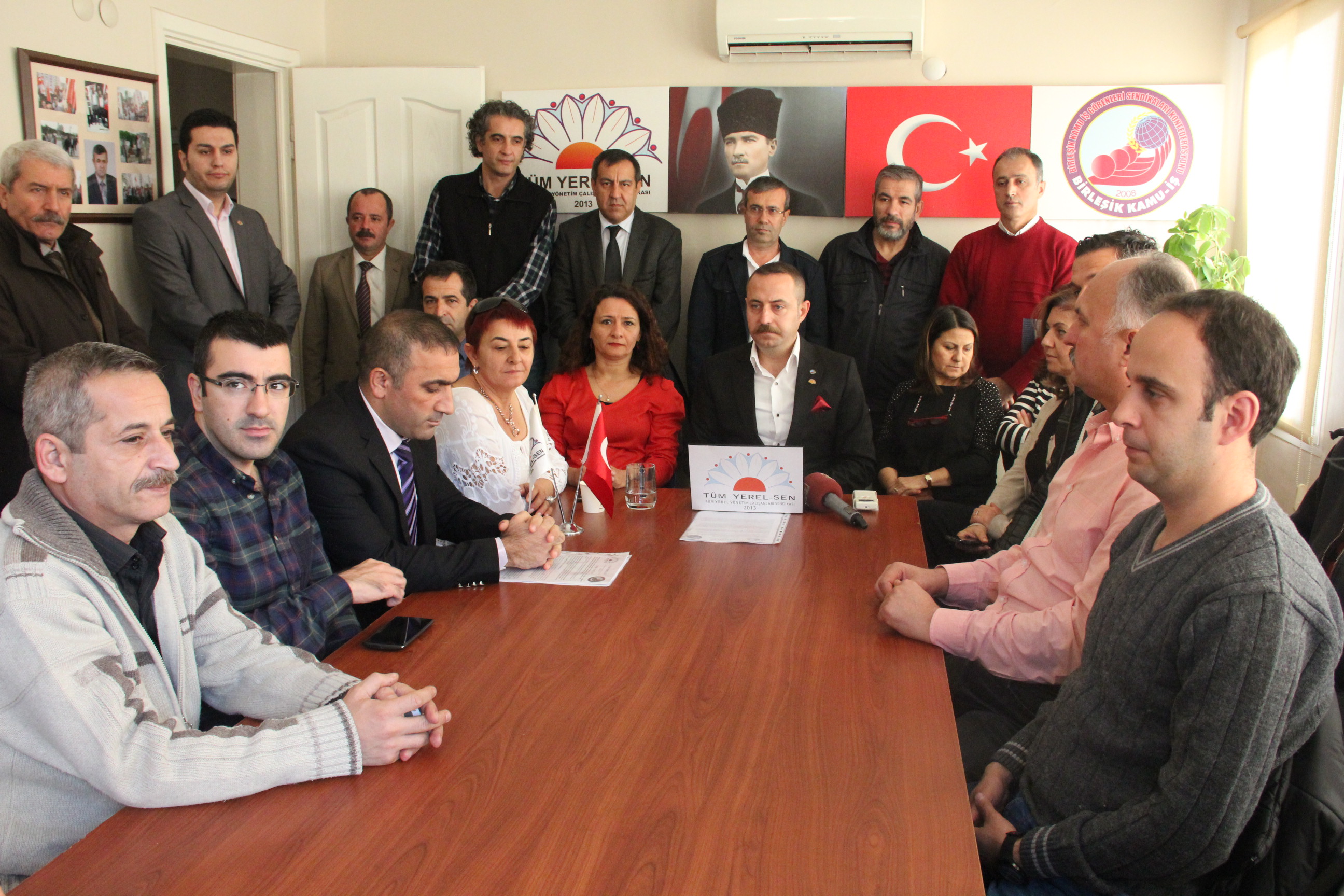 Konuyla ilgili sendika binasında açıklamalarda bulunan Tüm Yerel-Sen İzmir 1 Nolu Şube İdari Sekreter Bilal Altıner,”Bilindiği üzere Tüm Yerel-Sen sendikası olarak; İzmir Büyükşehir Belediyesi ve bağlı kuruluşlarında çalışan ve yaklaşık 6 bine yakın belediye emekçisi arkadaşımızı yakından ilgilendiren toplu sözleşme görüşmelerine 8 Aralık Salı günü yani yarın resmen başlıyoruz” şeklinde konuştu. Tüm Bel-Sen Genel Merkez ve şube yöneticilerinin el ele verip TİS sürecini baltalamaya çalıştıklarını ifade eden Altıner, “Öyle ki belediyeyi, valiliği ve sendikamızı yetkiyi gasp etmekle suçlayan Tüm Bel-Sen’in Şube Başkanı geçen yıl; Tüm Bel-Sen toplam sayıda öndeyken nedense İZSU’da Tüm Yerel-Sen’in sayıca fazla olmasının önemli olmadığını söylüyordu. İzmir Büyükşehir Belediyesi’ne bağlı İZSU ve ESHOT’un sayıları dâhil toplamda en çok üyesi olan sendikayla sözleşmenin yapılmasının yasaya uygun olacağını savunuyordu. Belediyeye “Yaptığınız yanlıştan vazgeçin” demiyordu. Dün dündür. Bugün bugündür anlayışıyla sendikacılık yapanları emekçilerin takdirine bırakıyoruz” şeklinde konuştu.