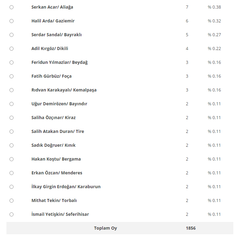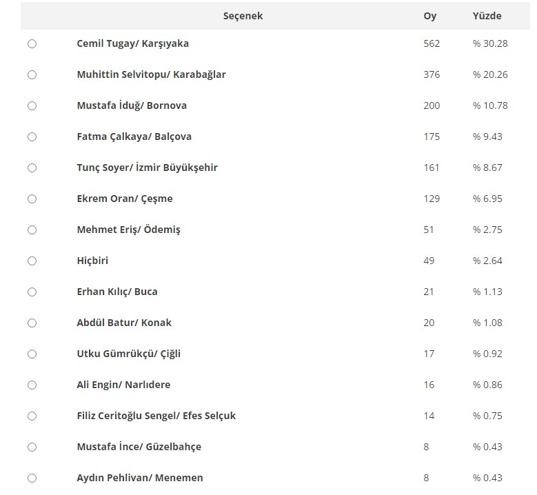 7 gün süren anketimize toplam 1856 kişi katıldı. İzmir’de görevinde olan 29 ilçe ve büyükşehir belediye başkanının isimlerinin yer aldığı ankette Urla Belediye Başkanı kısmı ise yazılmadı. Çünkü geçtiğimiz yıllarda Urla Belediyesi’ne kayyum olarak kaymakam atanmıştı.