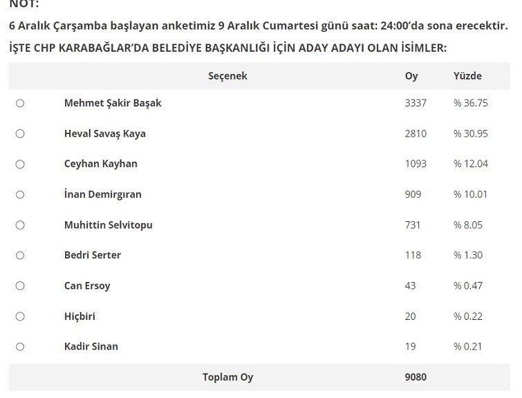 Anketimizde: “Karabağlar’da CHP’nin belediye başkan adayı olarak kimi görmek istersiniz?” sorusunu sorduk.