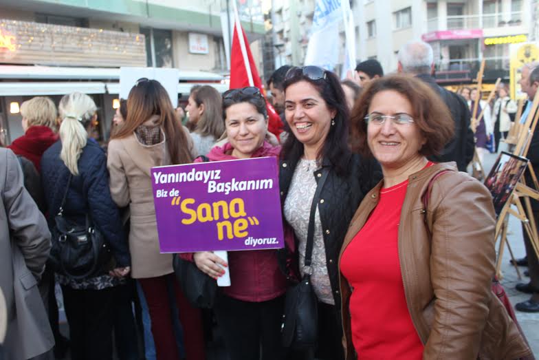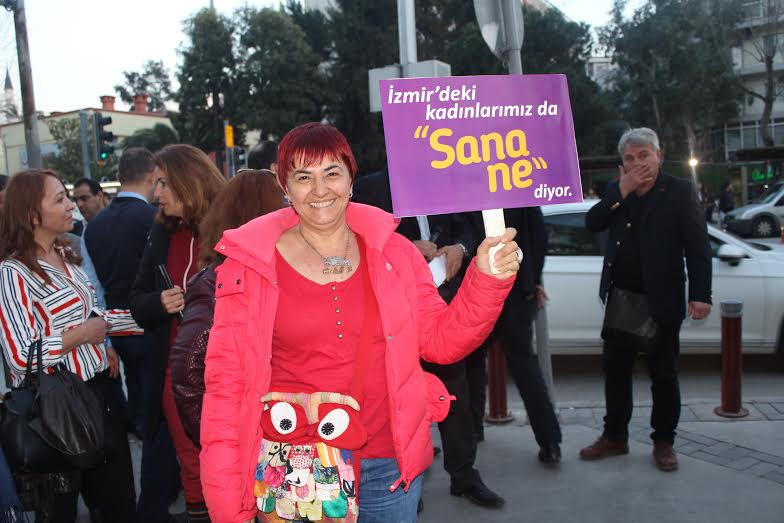 Birleşik Kamu İş Konfederasyonu İzmir il Temsilciliğinin Kıbrıs şehitlerinde 8 Mart Emekçi Kadınlar resim sergisinde Kadın Komitesi üyeleri Karşıyaka Belediye Başkanın hazırlattığı afişlere destek çıkıp hep bir ağızdan “SANA NE” dediler.