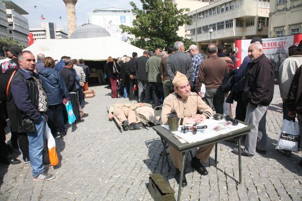 İZMİR'de Aile ve Sosyal Poltikalar İl Müdürlüğü tarafından düzenlenen etkinlikte, Konak Meydanı'nda Çanakkale savaşındaki cephe görüntülerinin benzeri oluşturulup, bir çadırda o dönemde askerlerin yemeği olan buğday çorbası, hoşaf ve ekmek dağıtıldı.
