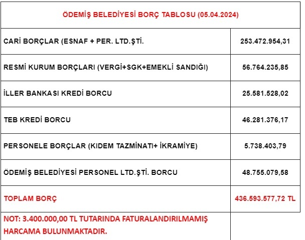Ödemiş Belediyesi’nin toplam borcu 5 Nisan 2024 tarihi itibariyle 436.593.577 Türk Lirasıdır. Ödemiş Belediyesi’nin toplam borcu belediyenin 2024 yılı bütçesinin %48,51’ine denk gelmektedir. Mevcut personel sayısı da 5 Nisan 2024 tarihi itibariyle 989’dur.