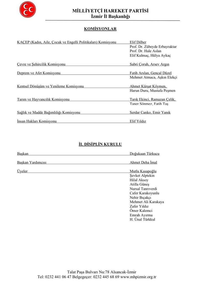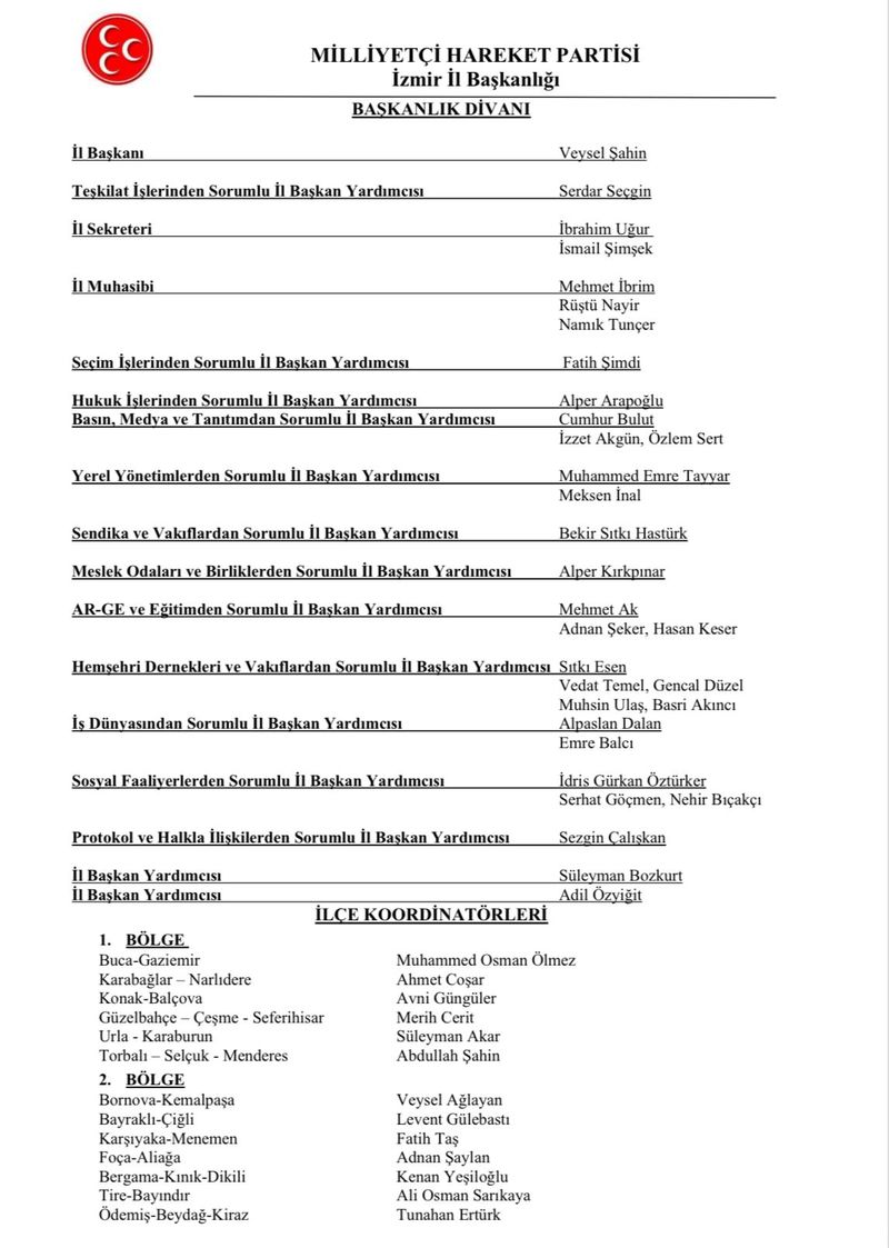 Milliyetçi Hareket Partisi İzmir İl Başkanlığı yeni başkanlık divanı açıkladı. Bugün akşam İl Teşkilatında düzenlenen olağan il yönetim kurulu toplantısında yeni Başkanlık divanını açıklayan İl başkanı Veysel Şahin’in divanında Profesörlerin olması dikkat çekti.